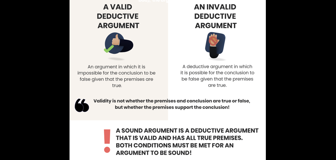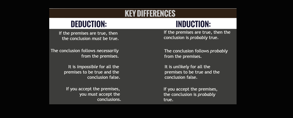 One of the most basic distinctions made in critical thinking courses is the distinction between deduction and induction. A deductive argument differs from an inductive argument in that deductive arguments prove conclusions with rigorous, inescapable logic.