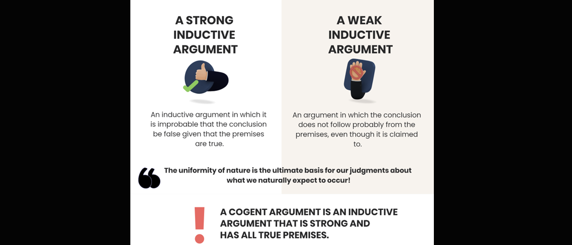 The "gold standard" critical thinkers seek when constructing or assessing inductive arguments is cogency. Much like soundness within deductive arguments, cogency requires the premises to be true. But in addition to the truth of the premises, the strength or pull of the inference being made is highly probable.