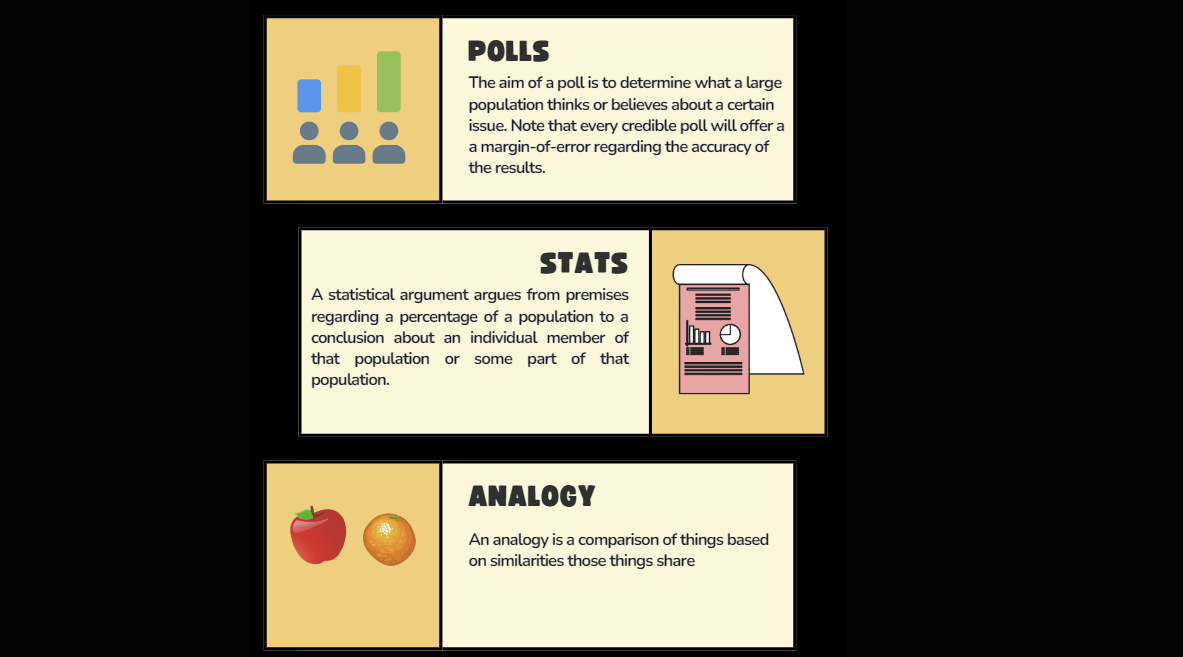 Inductive arguments show that conclusions are plausible or likely given the premises.Although based in probability, inductive arguments can be extremely powerful. Polls are a very common form of inductive argument. So, too, are weather forecasts and statistical arguments.