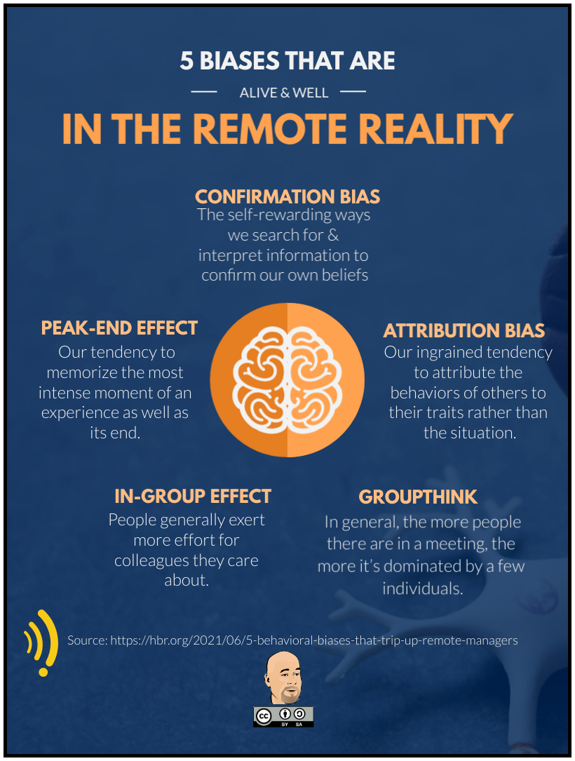 During the pandemic, the majority of classes were moved to a remote delivery. Many employers also switched to a remote setting. Unfortunately, the move did not lessen cognitive bias. Here is a short article exploring how some biases tend to thrive in a remote world.