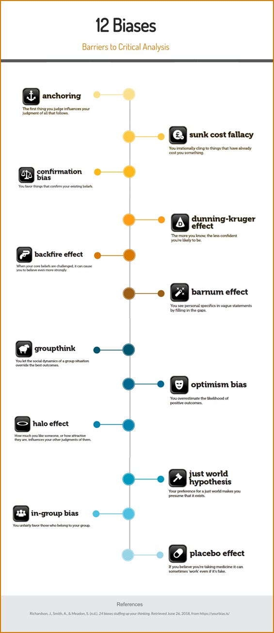 When DA is not objective, bias can creep in! As noted by Jesse Richardson, author of the website Your Bias Is, "cognitive bias means there’s a kind of misfiring going on causing us to lose objectivity." You can view several commonly encountered bias in the interaction below: