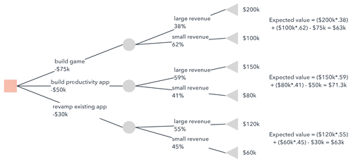 1. Using at least two tools, e.g. EDraw, Lucid Chart and TreePlan, construct a decision tree using the following data: