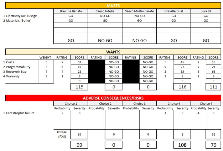 As the KT method is a "real-world" approach that strives to find the "best possible approach," prior to making a final assessment risks were admitted and added into the final metric. In this case, warranty data was used to assign a risk number reflecting catastrophic (total) failure. In the end, the fourth machine (the Breville Dual) possessed the most favorable assessment.